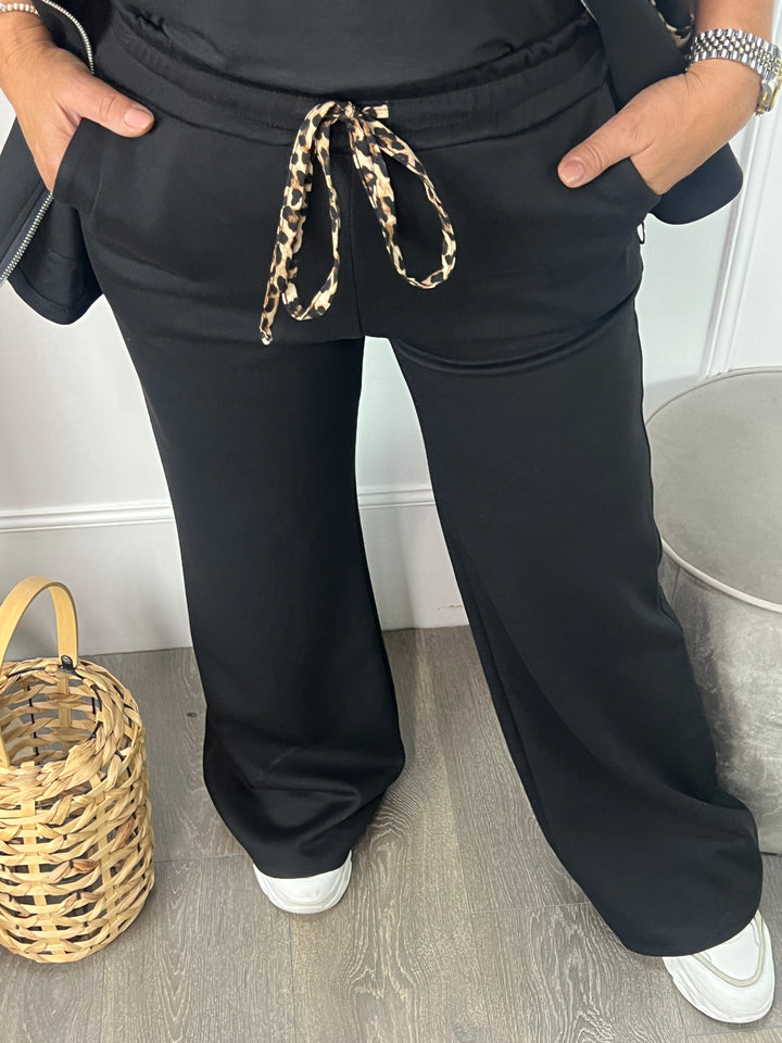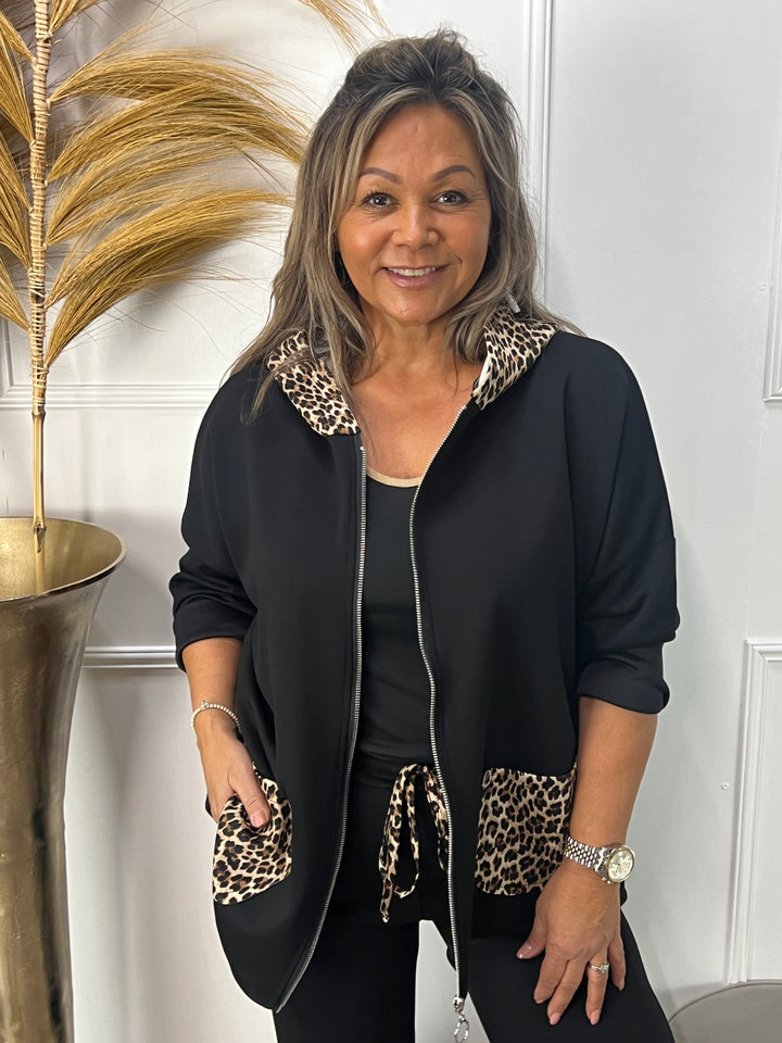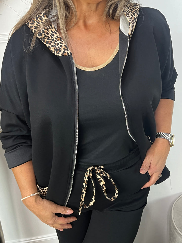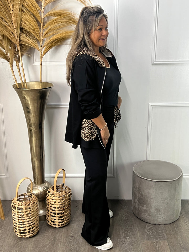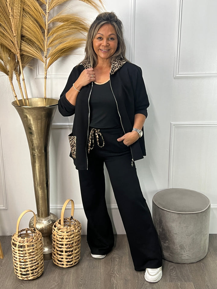 - Model: Deze tweedelige set met een leuke leopard touch. Bestaande uit een capuchon vest en een bijpassende broek.