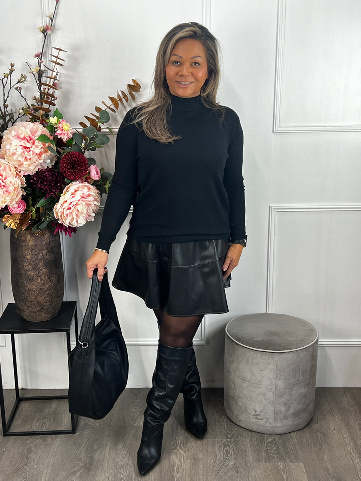 - Model: Een super leuk vegan leren klok rokje met een elastische tailleband. Echt onmisbaar in jouw kast, omdat je dit rokje echt eindeloos kan combineren. Met een basis coltruitje, een oversized gebreide trui, een net blouseje of een kanten top. Het kan echt allemaal!